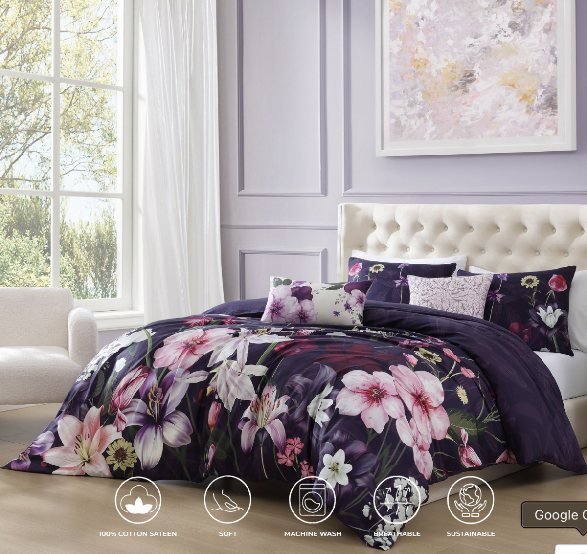 The Morning Glory 5 Piece Reversible Comforter Set introduces a palette of pink, purple, white, and yellow blossoms across a rich purple base. The reverse print offers a textured fabric look in matching deep purple for added depth.