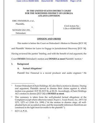 ATLANTA, Oct. 3, 2025 /PRNewswire/ -- In a significant victory for innovation in the music and blockchain industries, the U.S. District Court for the Northern District of Georgia has denied defendant nChain UK Ltd.'s motion to dismiss in the ongoing breach of contract lawsuit brought by music producer Eric Finnerud (known professionally as E. Smitty), Sound Alive Enterprise, LLC, and DistroMint, LLC. The ruling, issued by Judge Steven D. Grimberg on September 30, 2025, paves the way for the case to advance to discovery, allowing the plaintiffs to pursue their claims against the Swiss-based blockchain firm.