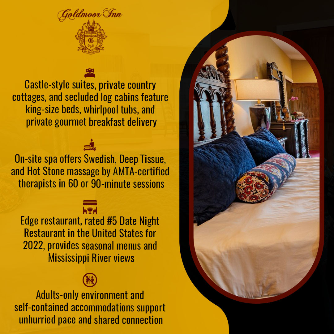 Goldmoor Inn is a luxury bed and breakfast in Galena, Illinois, offering 18 individually designed accommodations overlooking the Mississippi River valley. The property features castle-style suites, private cottages, and log cabins, along with Edge by Goldmoor Inn, an on-site restaurant, and a full-service spa. Designed exclusively for adults, the inn provides year-round lodging focused on privacy, comfort, and refined seasonal experiences. Winter reservations are available for travelers seeking a quieter, more intentional escape. To book a reservation, contact us at (815) 777-3925 or reservations@goldmoor.com.