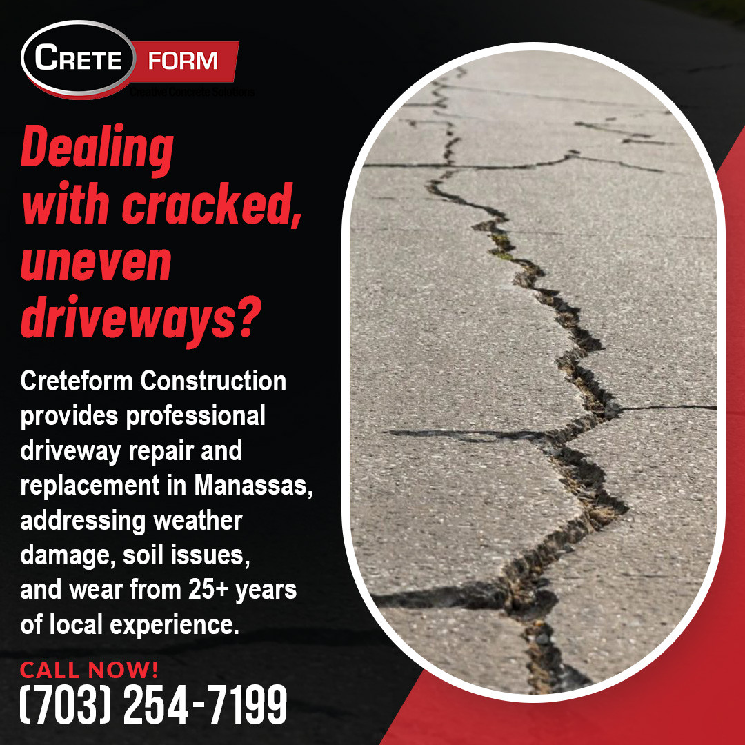 Manassas, VA - Driveways often face cracks, uneven slabs, and surface wear from weather, soil shifts, and heavy use. Creteform Construction provides professional driveway replacement and repair in Manassas, VA, to solve these common problems. With over 25 years of experience, the team delivers residential concrete services that improve safety, extend durability, and enhance curb appeal across Northern Virginia.
