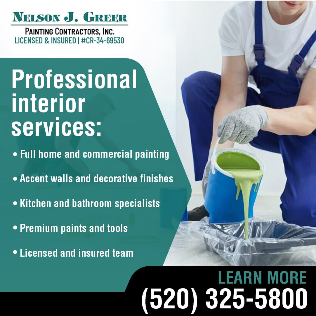 For consultations or free estimates, call (520) 325-5800. With decades of experience, a skilled team, and attention to detail, Nelson J. Greer Painting Contractors continues to be a trusted choice for professional interior painting services in Arizona.