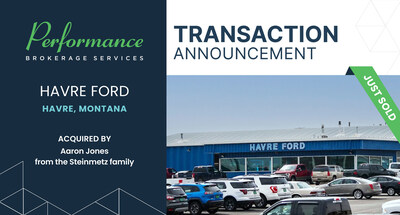 IRVINE, Calif., Oct. 16, 2025 /PRNewswire/ -- Performance Brokerage Services, North America's highest volume dealership brokerage firm, is pleased to announce the sale of Havre Ford in Havre, Montana from Charlie Steinmetz, Peter Steinmetz, and Steve Steinmetz to Aaron Jones.