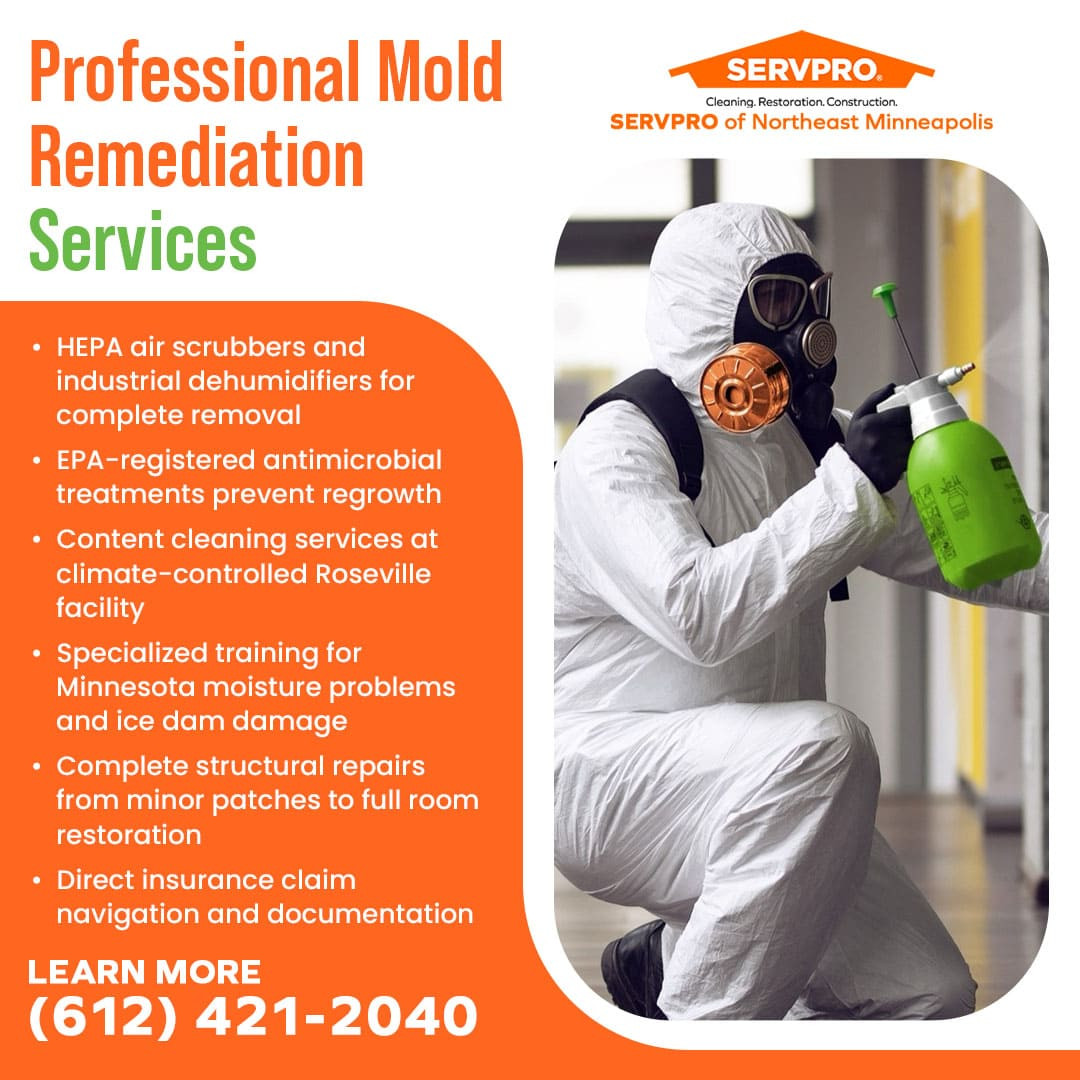 For immediate mold remediation assistance, contact SERVPRO of Northeast Minneapolis at (612) 421-2040 or email office@servpromsp.com. Visit them for additional information about their complete restoration services.