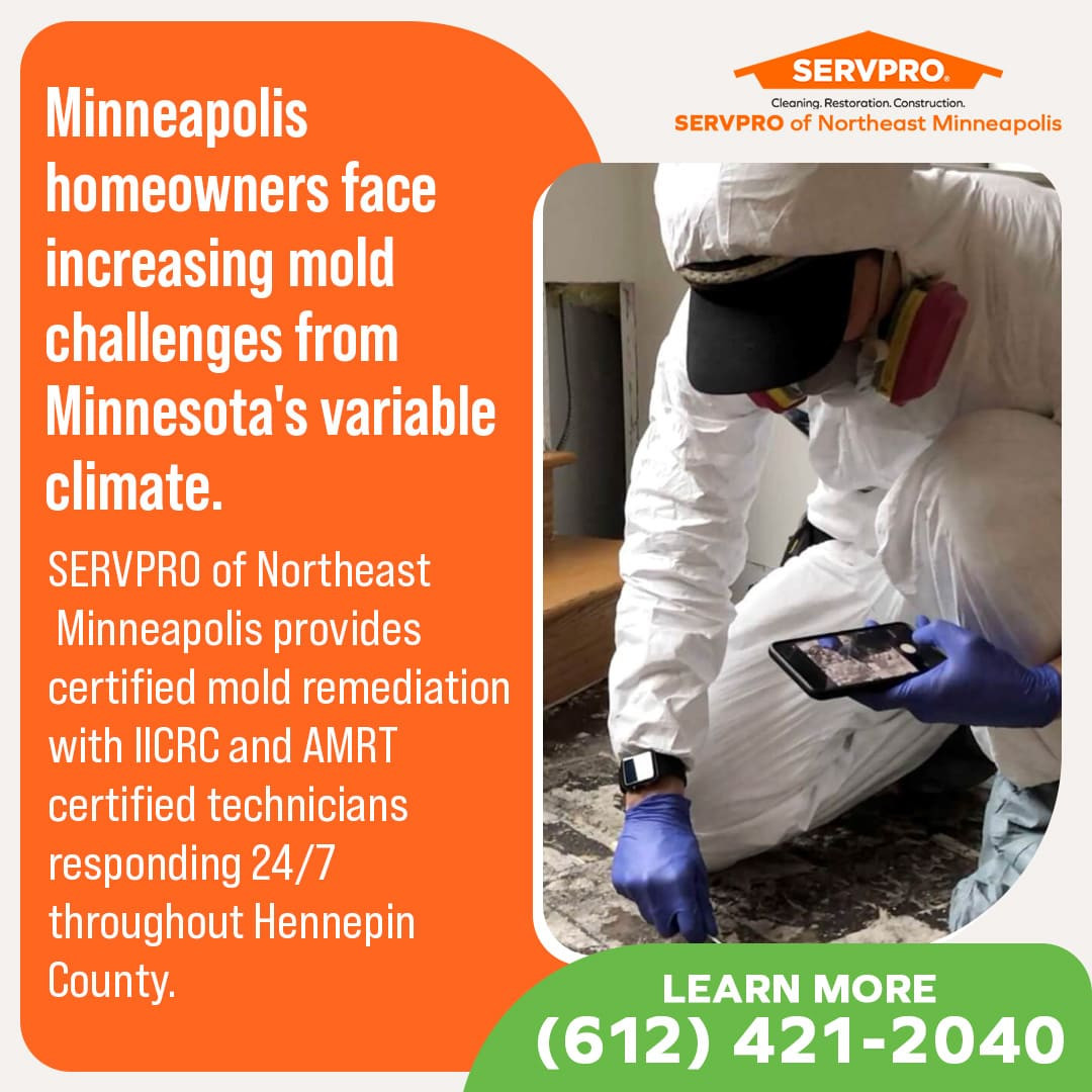 St. Anthony, Minneapolis: Minneapolis homeowners face increasing mold challenges due to Minnesota's variable climate and seasonal moisture patterns. SERVPRO of Northeast Minneapolis responds to these growing concerns with comprehensive mold remediation services designed to protect properties and families throughout Minneapolis.