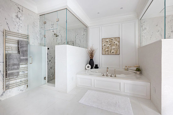 We specify sealers and finishes that stand up to steam and skincare. For marble lovers, honed surfaces and proper care make it realistic; porcelain slab is a stunning, low-maintenance alternative.